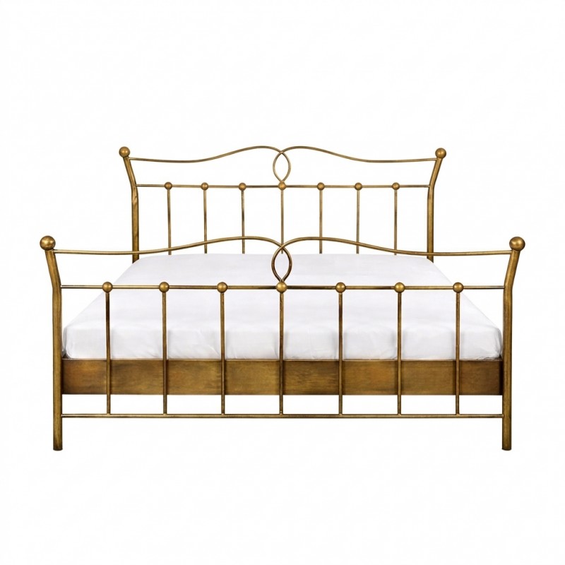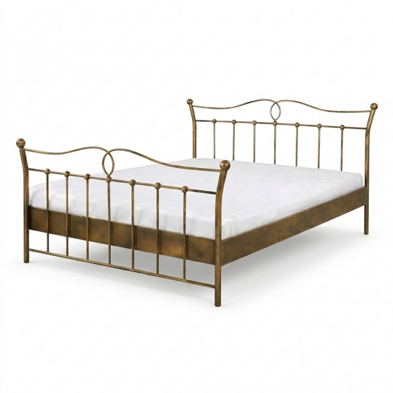 LIZA to łóżko małżeńskie przedstawiające wysoki tył i wezgłowie ozdobione kulistymi zakończeniami i fantazyjną pętelką. Metalowa konstrukcja została ręcznie pokryta patyną