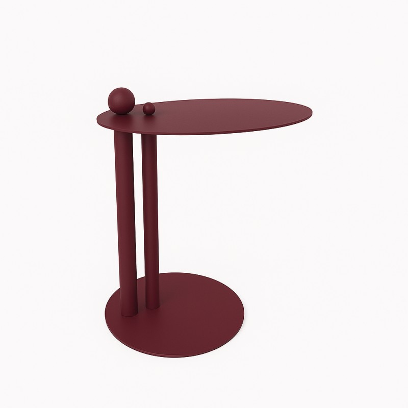 Na zdjęciu widoczna wersja stolika łączącą matową strukturalną podstawę pomarańczową z blatem granatowym w polysku, a także wersja całkowicie pokryta farbą bordową w matowej strukturze!