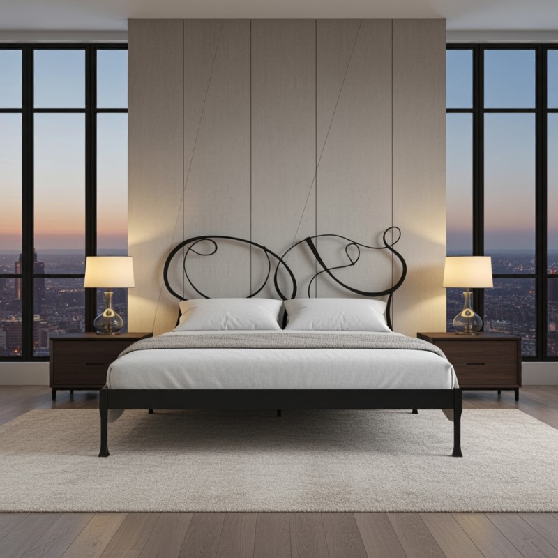 VIRGO to ręcznie kute łóżko, które zachwyca wysokim, ozdobnym wezgłowiem tworzącym unikatową dekorację ścienną w sypialni